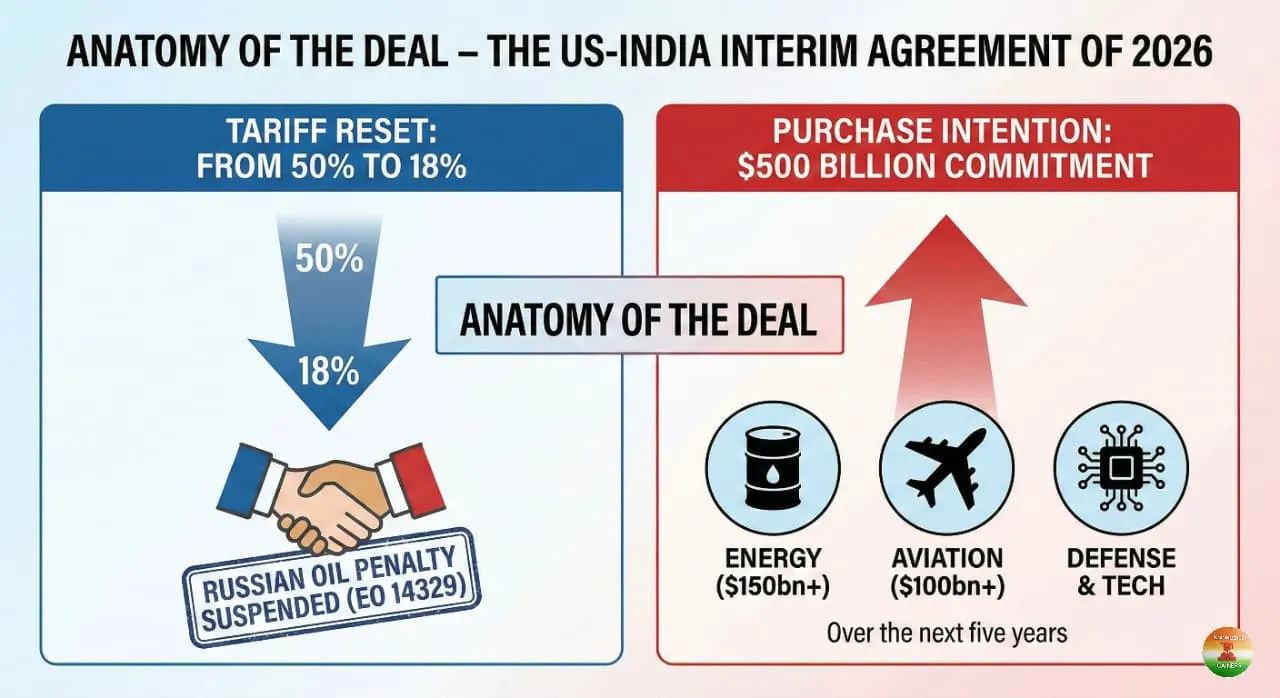 The "Interim Agreement" announced on February 9, 2026, is a diplomatic salvage operation designed to avert the rupture of the US-India economic relationship. It is not a comprehensive Free Trade Agreement (FTA) in the traditional sense, lacking the detailed chapters on intellectual property, labor standards, and dispute resolution typical of such treaties. Instead, it is a transactional framework: a "peace deal" in the trade war that swaps tariff reductions for geopolitical alignment and purchase commitments.