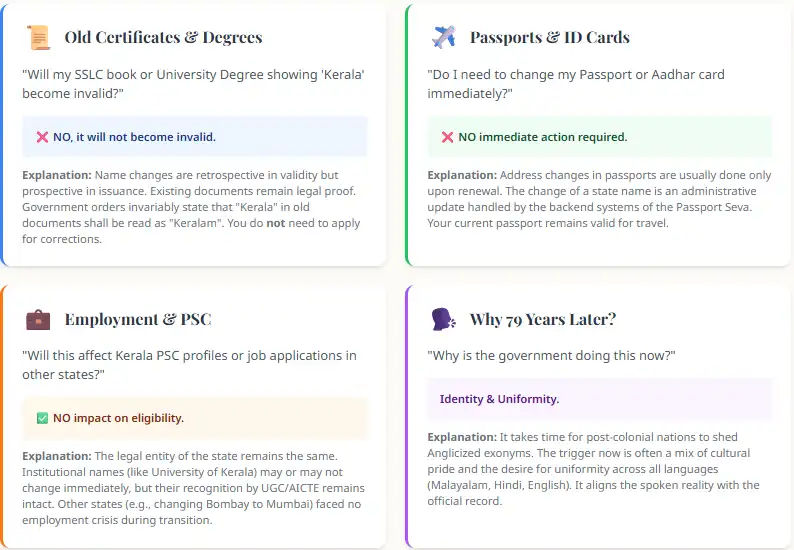 The biggest worry for common citizens during a state name change is the validity of their paperwork. Will your degree from "Kerala University" become invalid? Will you get rejected from a government job because your domicile certificate says "Kerala" instead of "Keralam"?