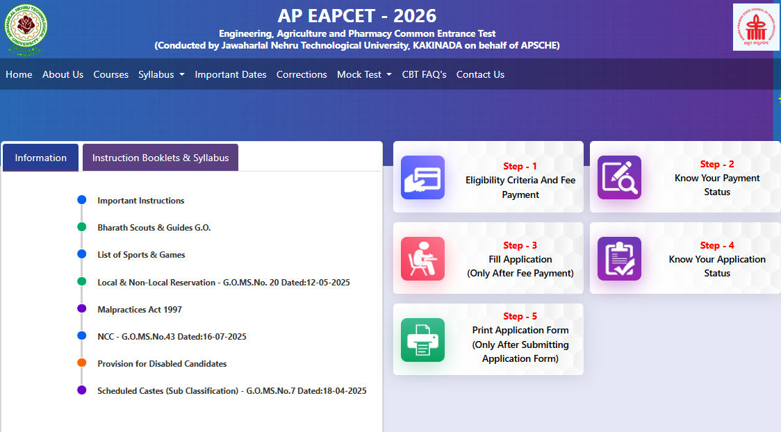 The Andhra Pradesh Engineering, Agriculture and Pharmacy Common Entrance Test (AP EAPCET) 2026 is a state-level entrance examination conducted by Jawaharlal Nehru Technological University (JNTU), Kakinada, on behalf of the Andhra Pradesh State Council of Higher Education (APSCHE). It is meant for students seeking admission into various Under Graduate professional courses in Engineering, Agriculture, and Pharmacy across the state of Andhra Pradesh for the academic year 2026-27.