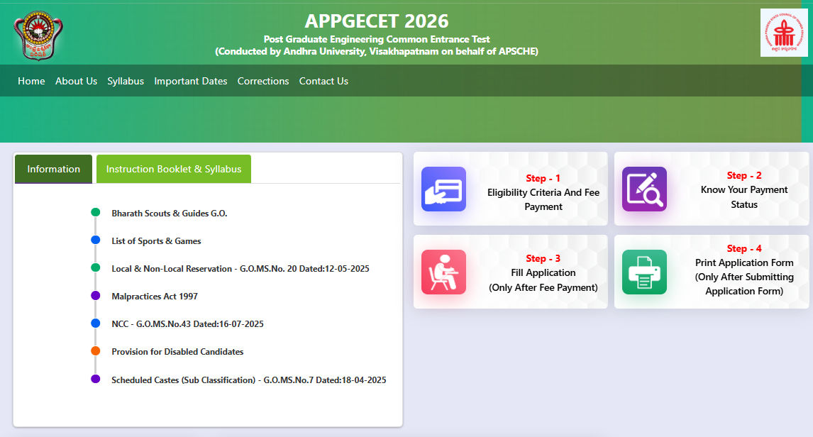 The Andhra Pradesh Post Graduate Engineering Common Entrance Test (AP PGECET 2026) is a state-level entrance examination conducted by Andhra University, Visakhapatnam, on behalf of the Andhra Pradesh State Council of Higher Education (APSCHE). It is strictly for admission into regular Postgraduate courses in Engineering, Technology, and Pharmacy (M.E. / M.Tech. / M.Pharm. / Pharm.D (PB)) in University and Affiliated Engineering / Pharmacy Colleges across Andhra Pradesh for the academic year 2026-27.